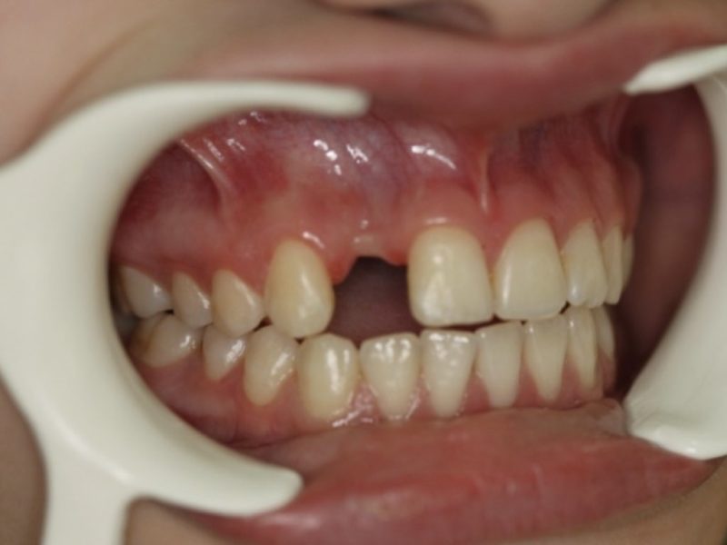 The patient came to our attention with the specific request to restore the aesthetic of her smile ruined by the missing of element 12. Therefore to perform the replacement of the anterior tooth we had to take in great consideration the highly aesthetical area and her very young age. We evaluater 3 treatment options: provide the patient with a partial denture, but due to her very young age did not seem the best way to pursue or prepare a fixed bridge,(3 units ,cantilever and/or Maryland) or insert an implant to provide her a comfortable solution to restore her self-confidence.